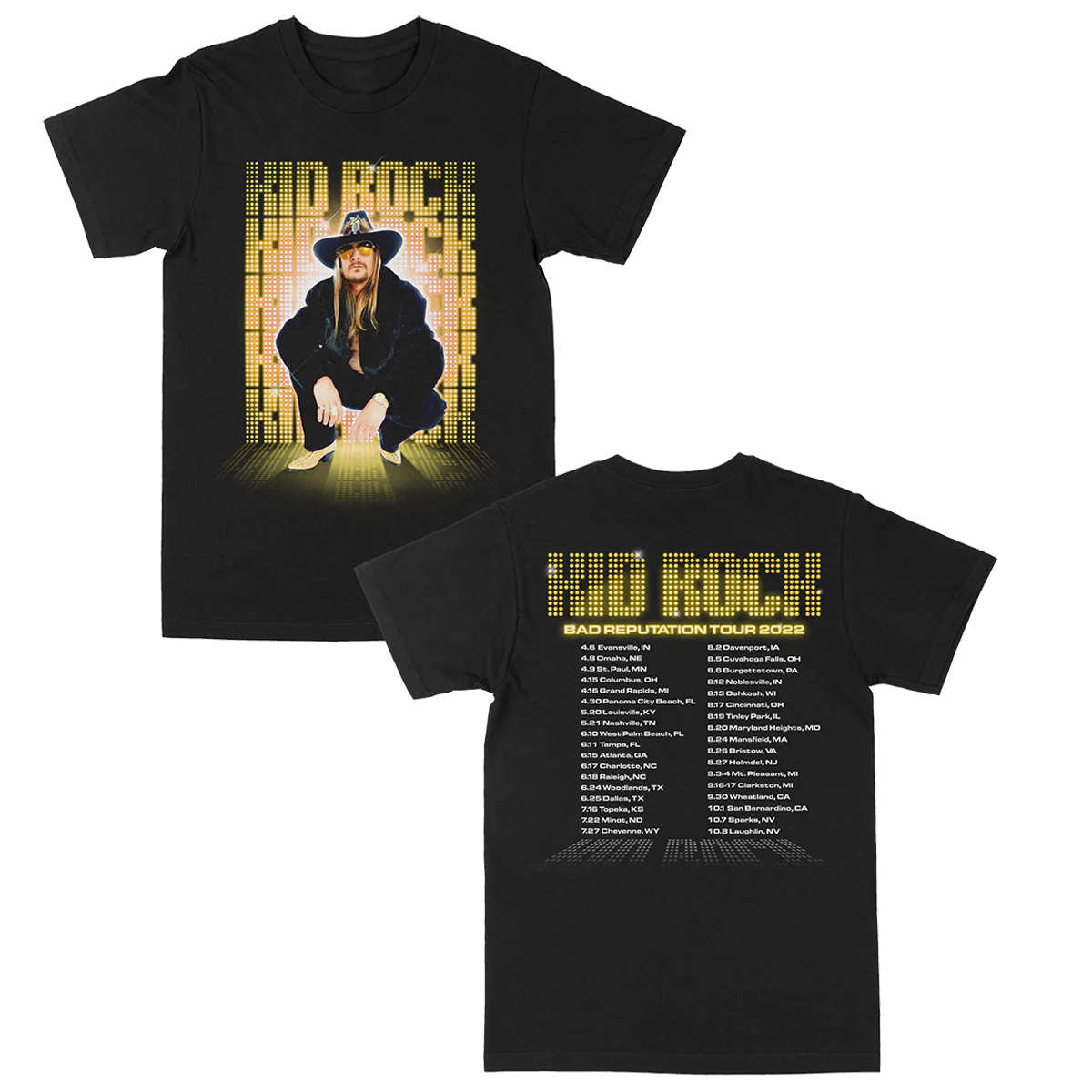 Black shirt featuring the Showtime photo design on the front and the 2022 Bad Reputation tour dates on the back.